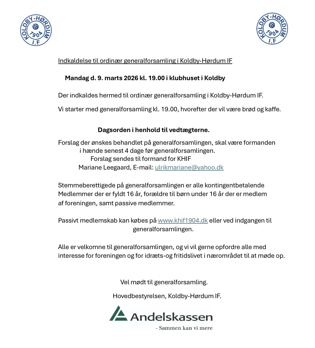 Indkaldelse til ordinær Generalforsamling KHIF 2026: